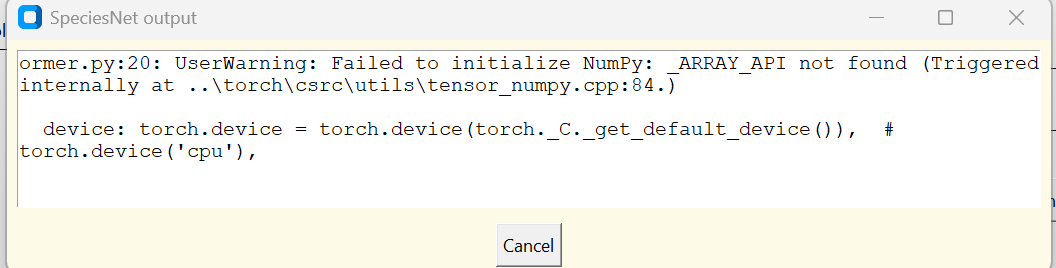 This is only related to the first issue (_ARRAY_API not found); the second issue (no attribute ‘setsid’) does not appear to be related to SpeciesNet.