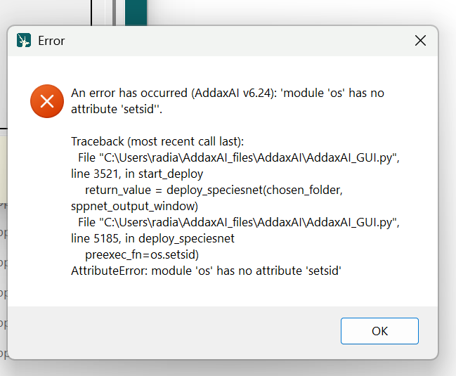 Thanks for getting back to me! Thanks for the instructions to access the Addax AI SpeciesNet env. I was able to get SpeciesNet to run through AddaxAI by downgrading my numpy version.